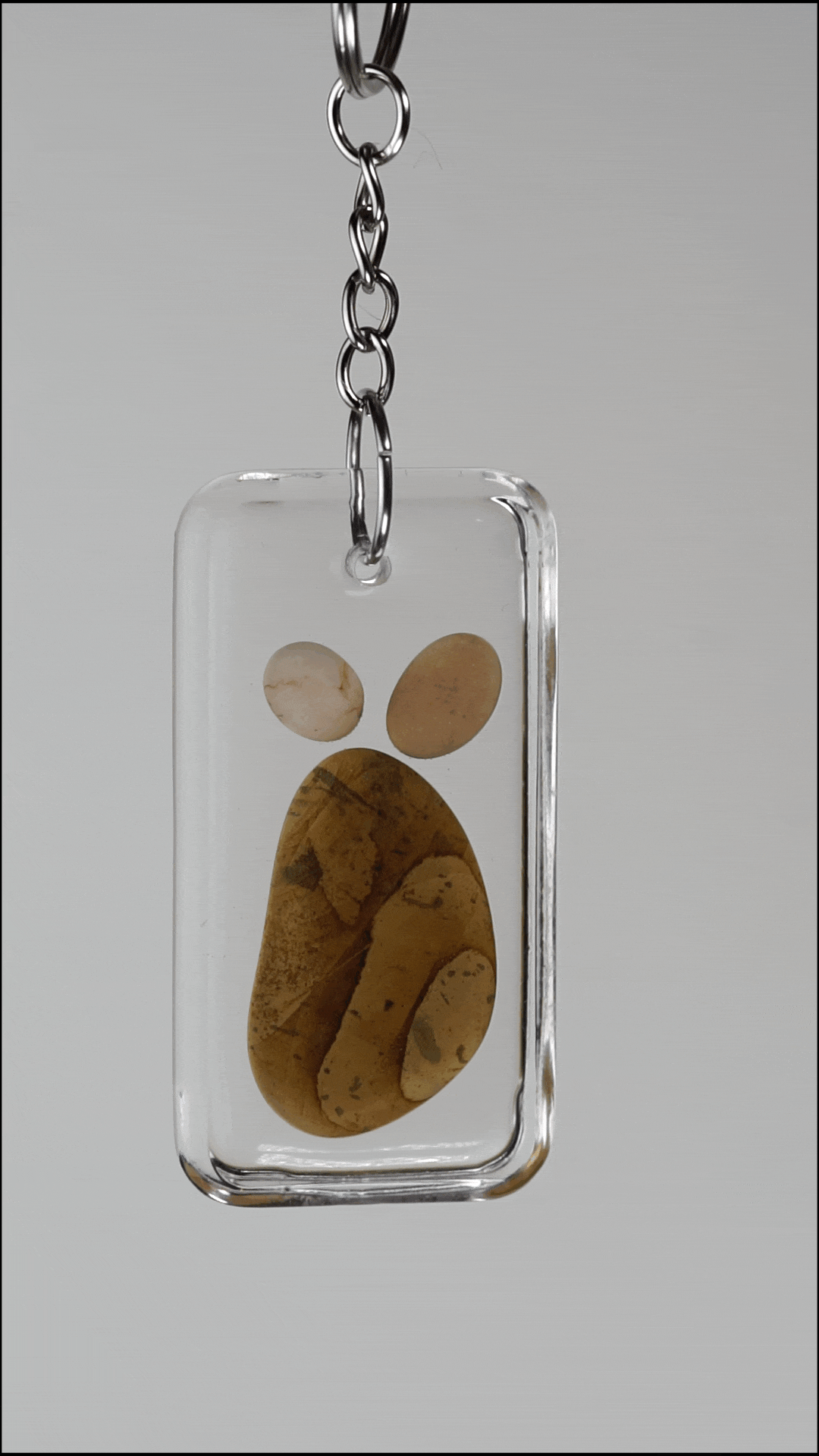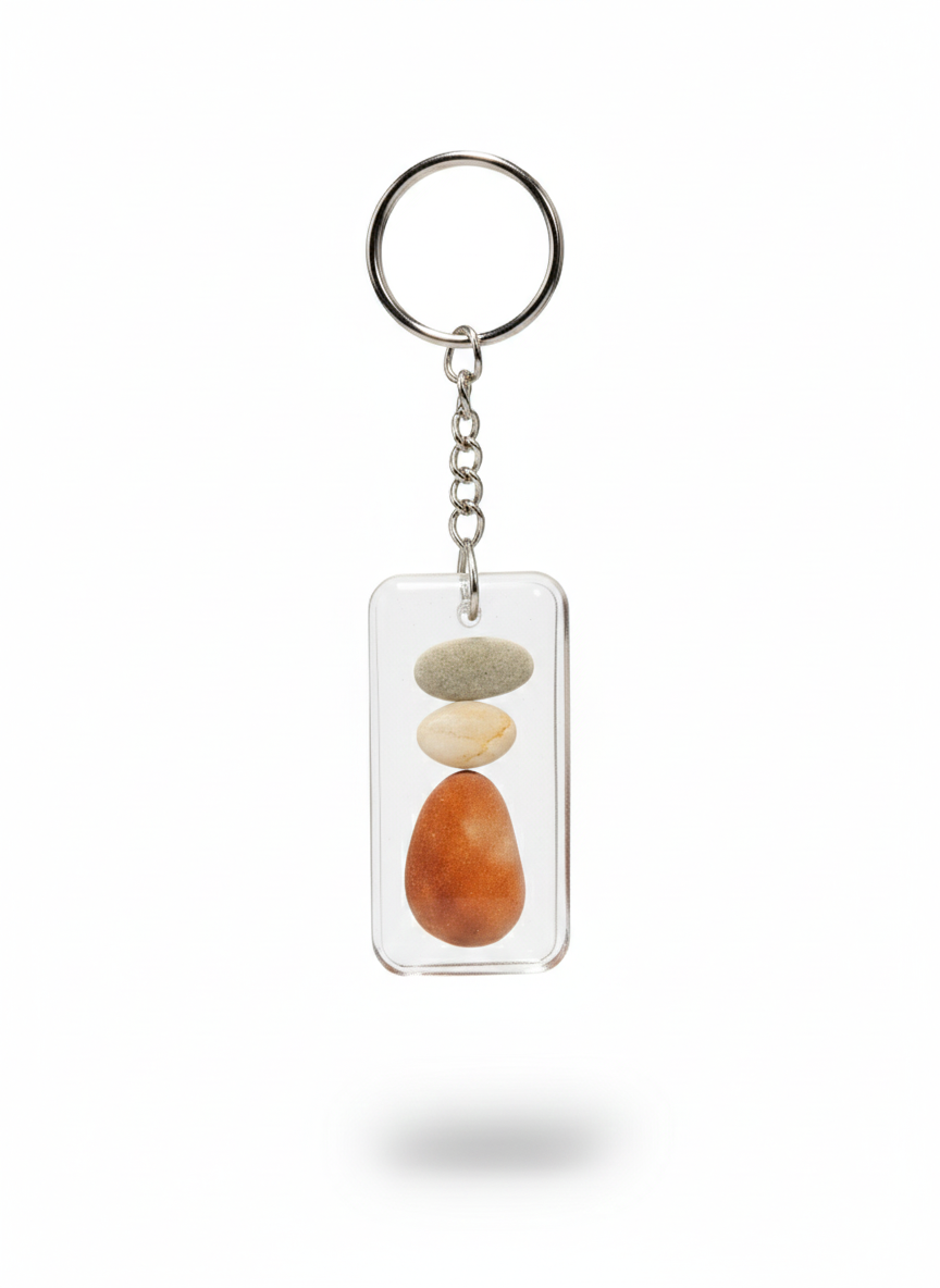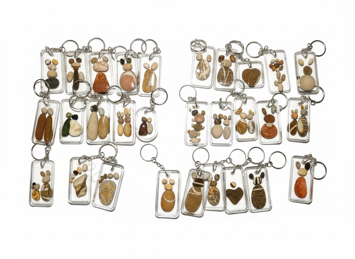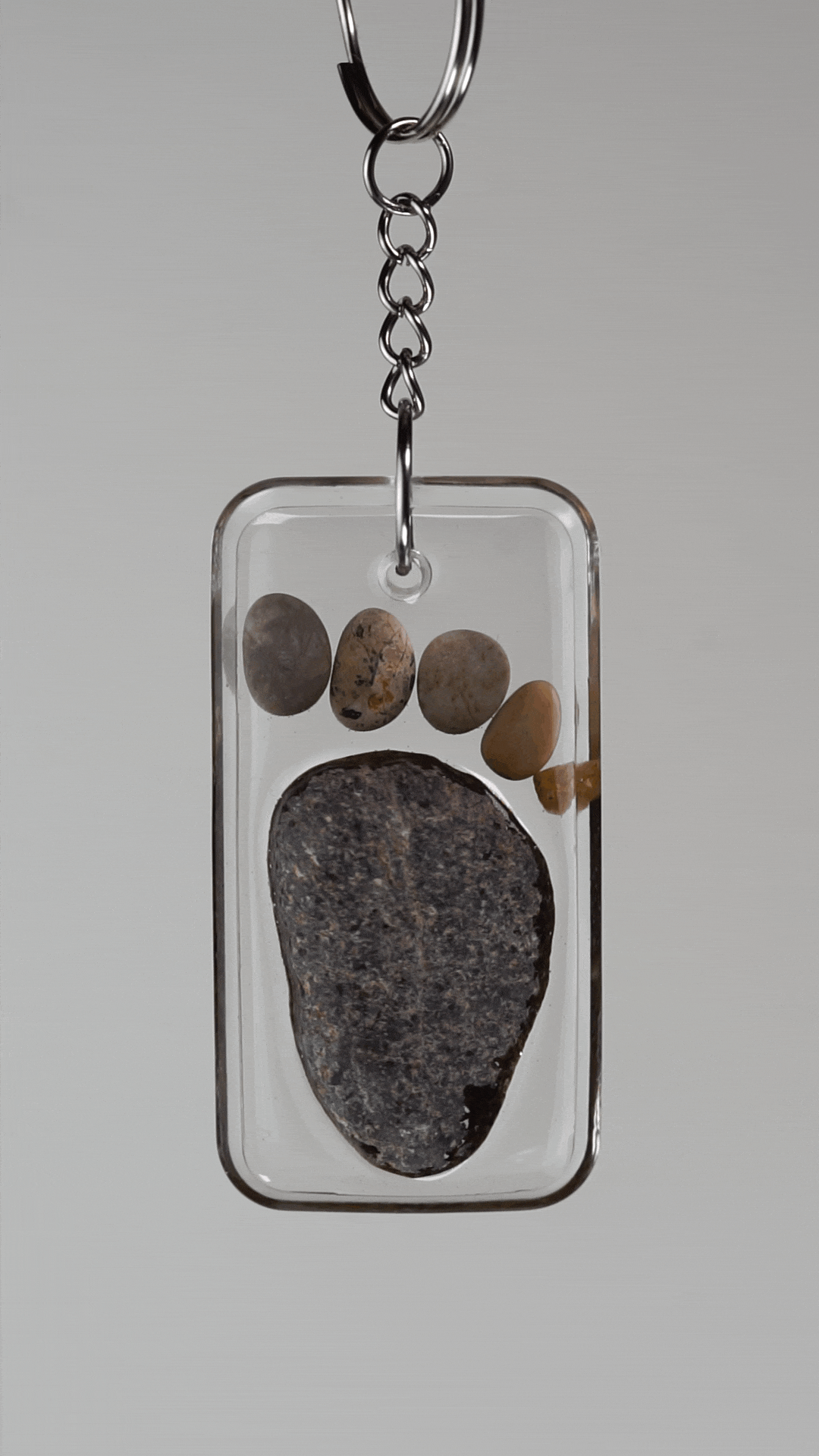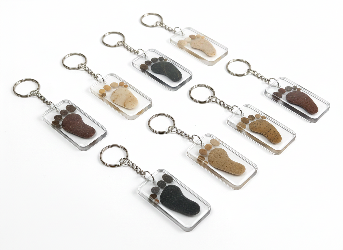 Echte Handarbeit: Jedes Motiv – von charmanten Fußabdrücken bis hin zu abstrakten Stein-Arrangements – wird von Hand in hochwertiges, glasklares Kunstharz (Resin) eingegossen. Auf der Rückseite ist mindestens ein Stein in seiner natürlichen Oberfläche ertastbar. So wird der Zauber von "nass" zu "trocken" ersichtlich.